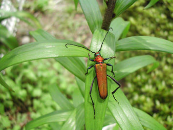 教材池のハスの葉にとまっているきれいなカミキリムシを見つけました。青緑色の光沢がとてもきれいなアオカミキリです。弱っているようだったので、撮影後すぐに放してやりました。